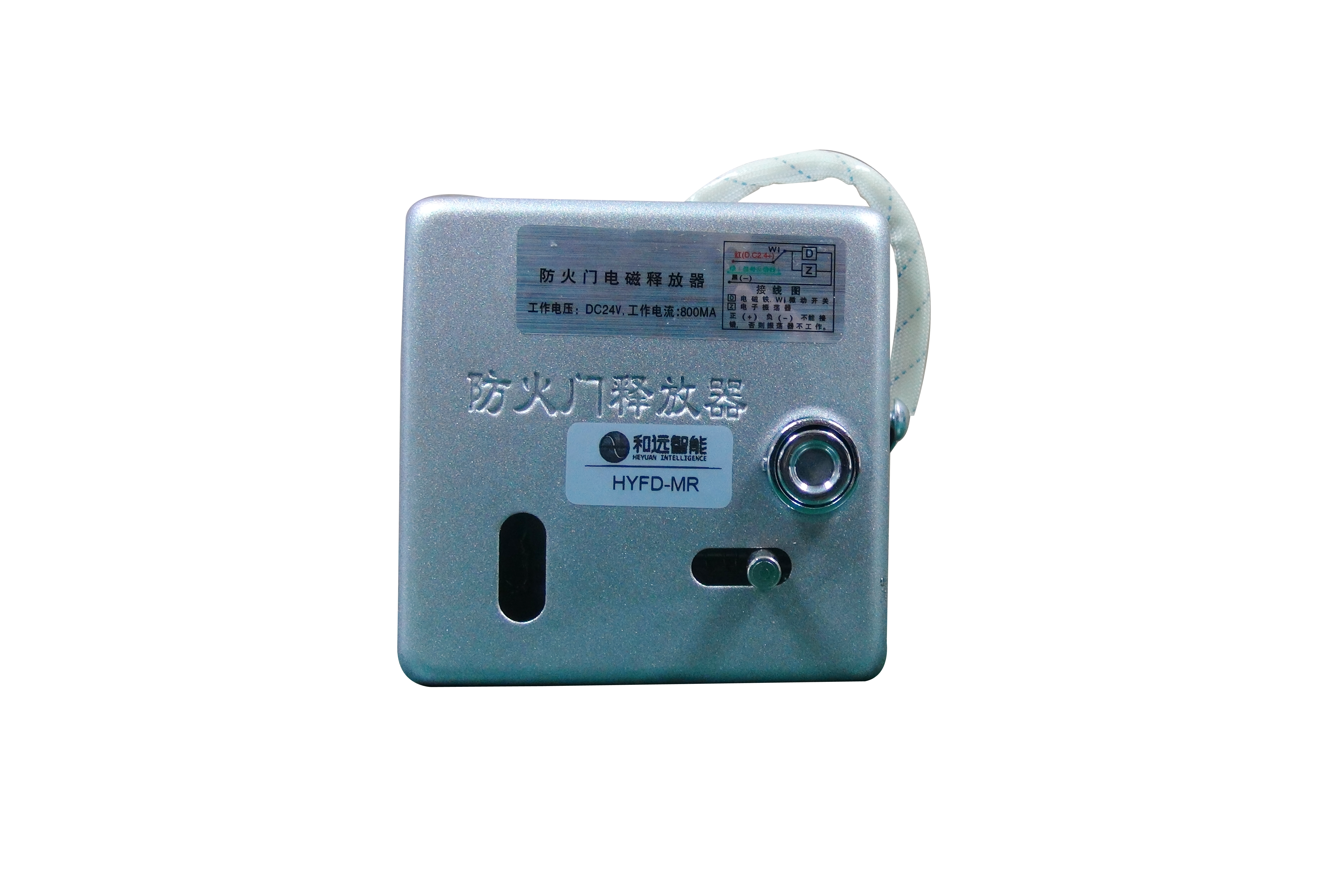 簡介: 電磁釋放器HYFD-MR,平時鏈條被釋放器槽內的傳動軸鎖住,門體保持常開狀態;當火災發生時,防火門監控器DC24V釋放電源打開電磁釋放器,鏈條脫開,防火門自動關閉。