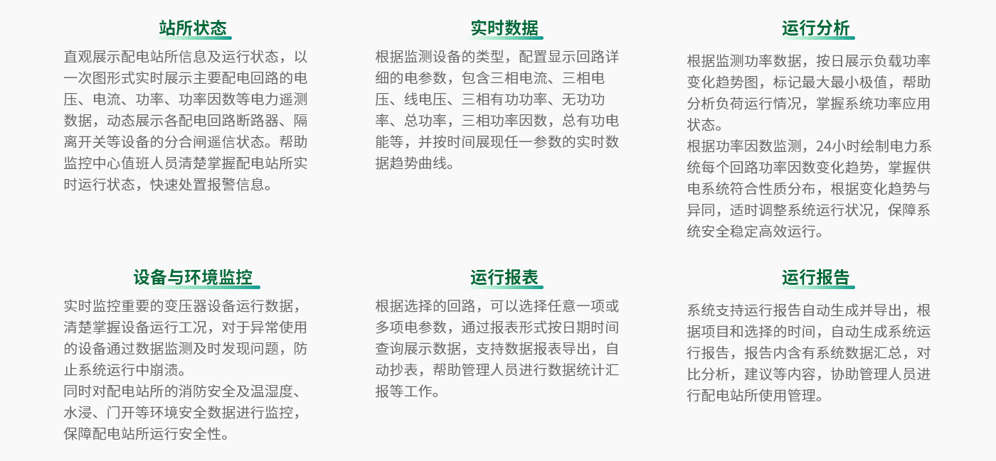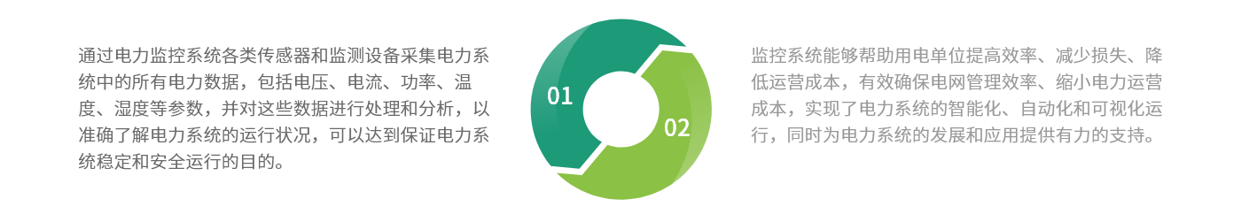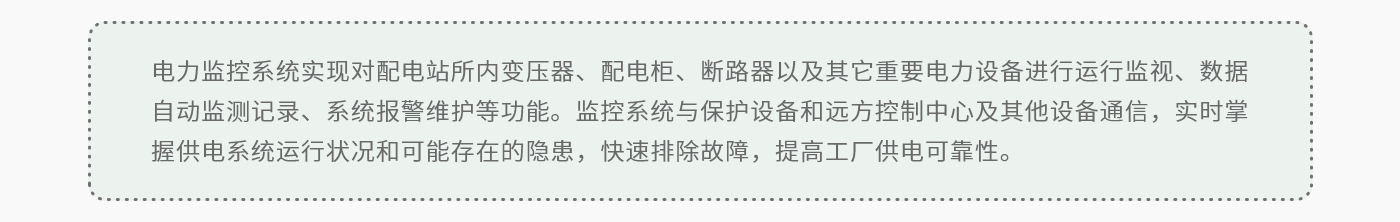 電力監(jiān)控系統(tǒng)實現(xiàn)對配電站所內變壓器、配電柜、斷路器以及其它重要電力設備進行運行監(jiān)視、數(shù)據(jù)自動監(jiān)測記錄、系統(tǒng)報警維護等功能。